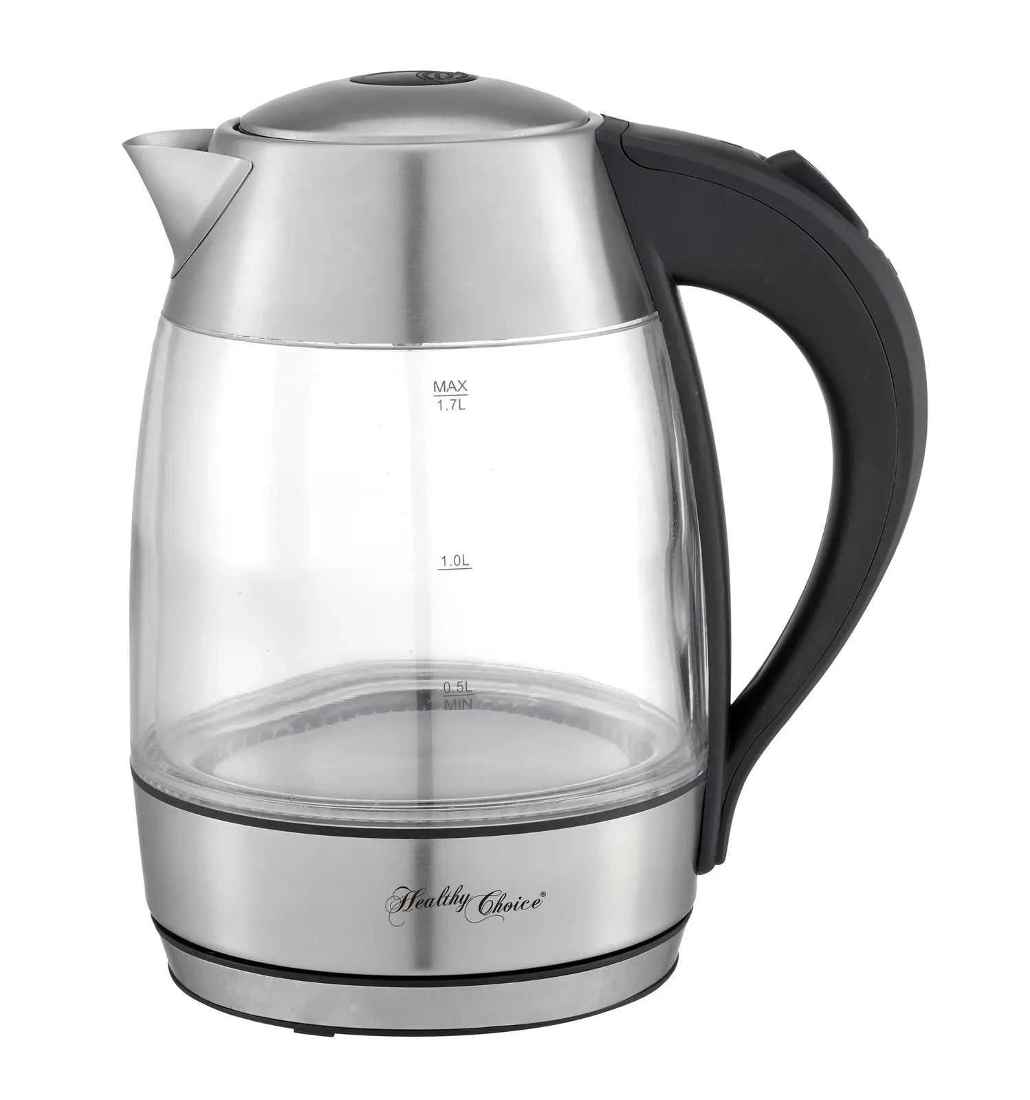 GLASS KETTLE, 1.8 LITRES.LED LIGHTS,1800 WATTS,STAINLESS STEEL HANDLE AND RIM, SAFETY LOCK DURING BOILING,